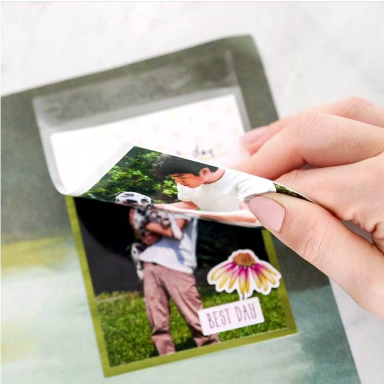 These clear, photo-safe pockets (10/pk — 5 horizontal, 5 vertical) allow you to slide photos, journal mats or artwork into the pockets and use the adhesive strip to easily attach them to your pages or the album binding. And they’re repositionable, so if you want to change where you placed your pockets, you can easily move them.