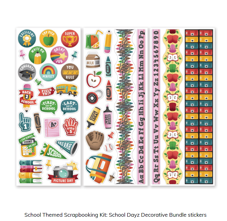 Bring your school stories to life with the School Dayz Decorative Bundle! This school themed scrapbooking kit includes 12×12 photo-safe designer papers and annual papers, a variety mat pack, stickers, embellishments and XL layered embellishments. It’s perfect for photos of posing with favorite teachers, exciting field trips, study sessions with friends and after-school activities of all kinds.
