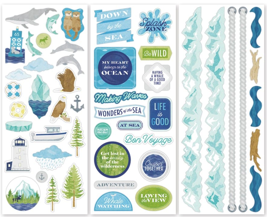 Let your creativity set sail with the Seas, Please! Stickers. These nautical scrapbooking stickers are perfect for your at-sea memories themes like fish, cruise ships, forests, whales and glaciers. You’ll love it for making  scrapbooks of Alaskan cruises, indulging in fresh seafood, fishing, hiking and witnessing wildlife and glaciers.