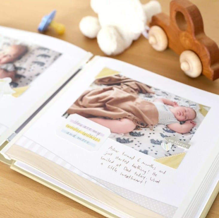 • 8×8 Lemon Ice Shimmer Welcome Baby Album: This bookcloth album comes filled with 15 predesigned pages with monthly titles to help guide you through where to place photos from baby’s arrival until the first birthday. There are also two pages at the front of the album for “Before You Were Born,” should you wish to add ultrasound, baby shower or gender-reveal photos. It’s time to print out those monthly baby photos!