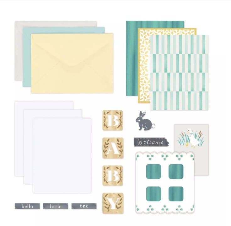 You’ll love decorating your cards with sayings like “Welcome, baby,” “Congratulations on your new baby” and “Hello little one,” as well as die-cut icons of wooden blocks, a bunny and an embroidery hoop, plus laser-cut pieces to layer over the papers. Complete with instructions, this kit is perfect to mix and match with the Welcome Baby collection and vice versa!
